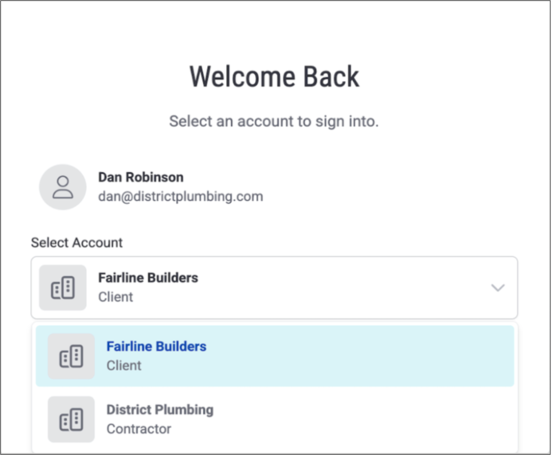 All users will be asked to input their email address and password to complete the login process. If a user has access to both profile types, the user will then be prompted to select "Contractor" or "Client," as shown in the screenshot below.