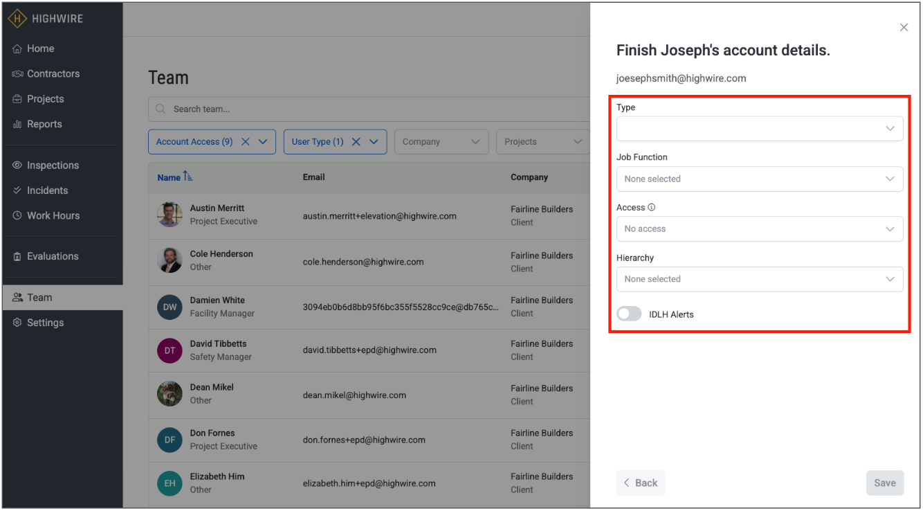 4. A second set of required fields will open that includes member type, job function, access, and hierarchy. Note that the default for access type is “No access”, which creates the team member as a contact only and does not give them access to the Highwire application: