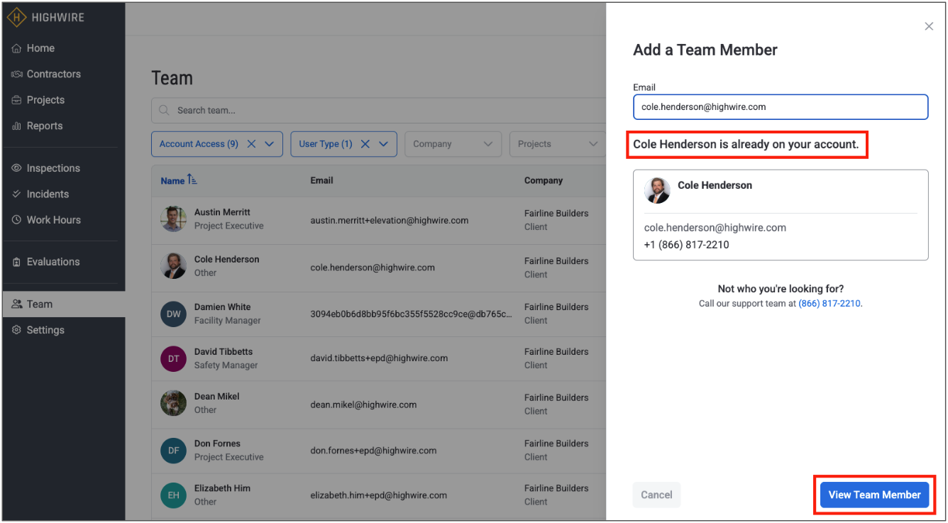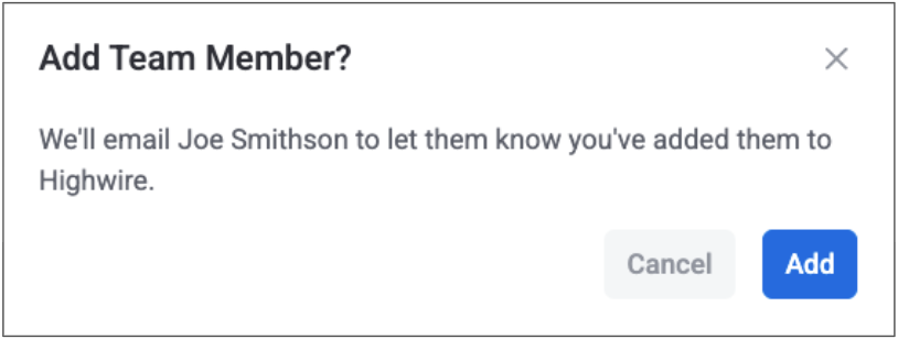 2. A slide-over will open that asks for the email address of the new team member. To prevent duplicate entries, the system will check if the email already exists in Highwire and prompt you if it does