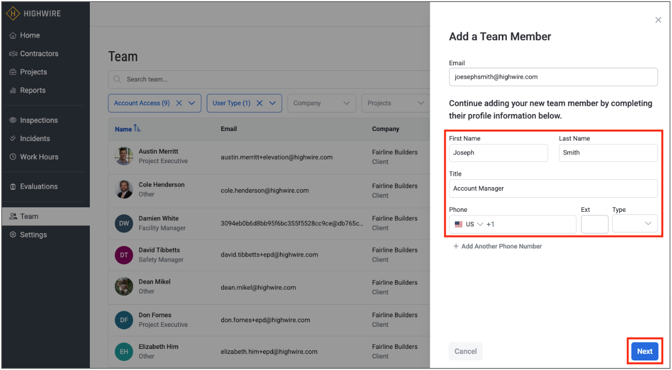 From the Team tab, you can easily add new contacts and new Highwire application users: