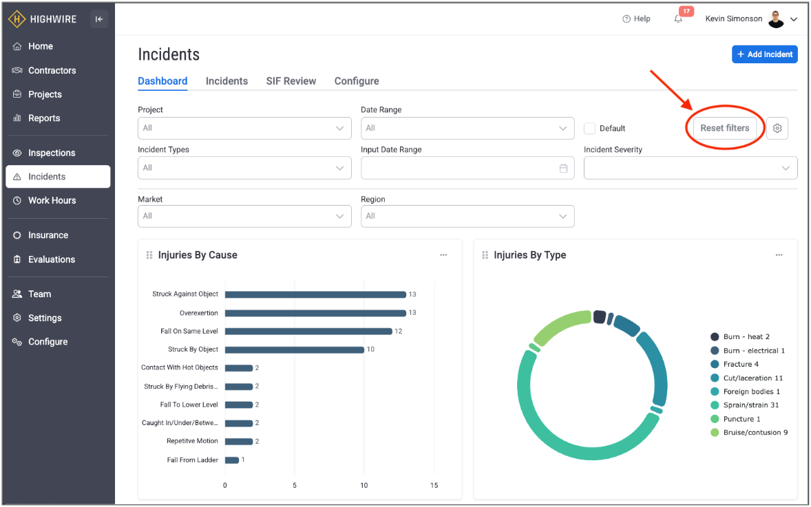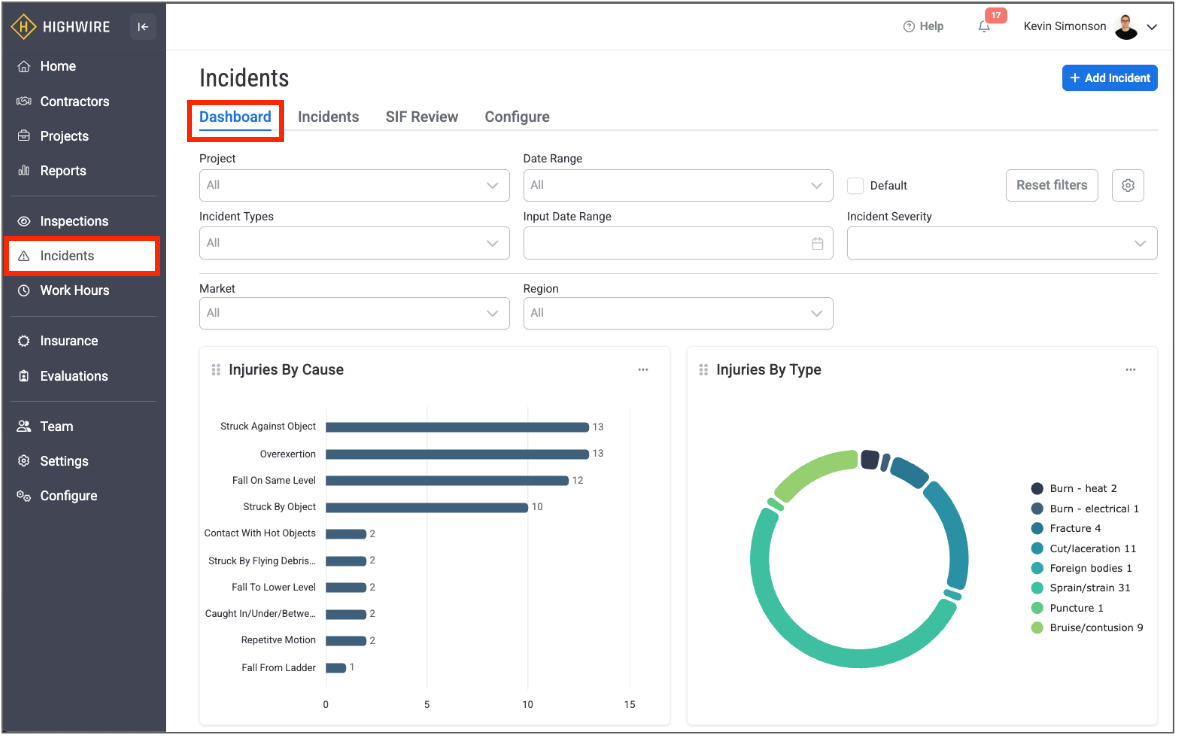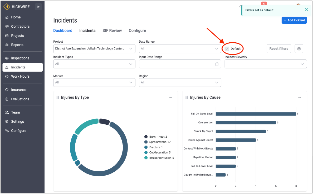 Your default dashboard is set to include all incidents across all of your projects, but you can refine your list by setting any of the available filters, including projects, incident types, region, date range, and market: