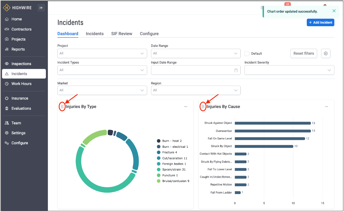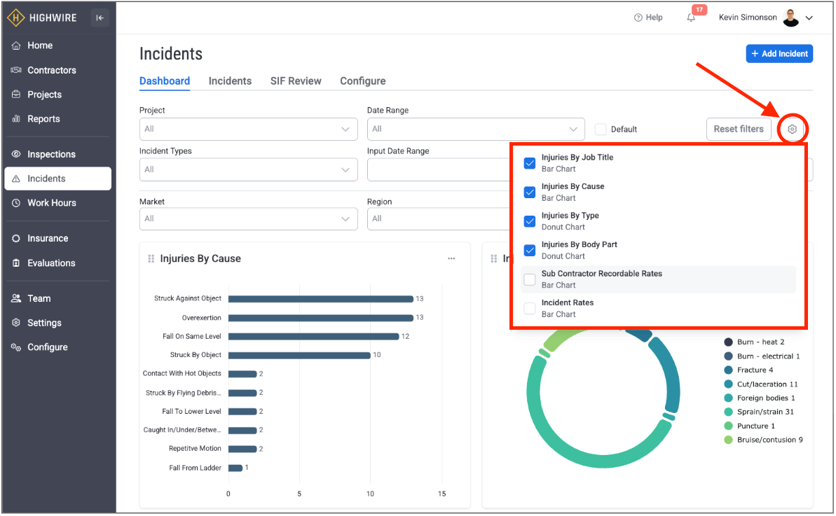 Customize the charts you want displayed to highlight the incident and injury information most important to you. Click the gear button to select which charts appear on your Dashboard, then click the left corner of a chart to adjust its position on the page: