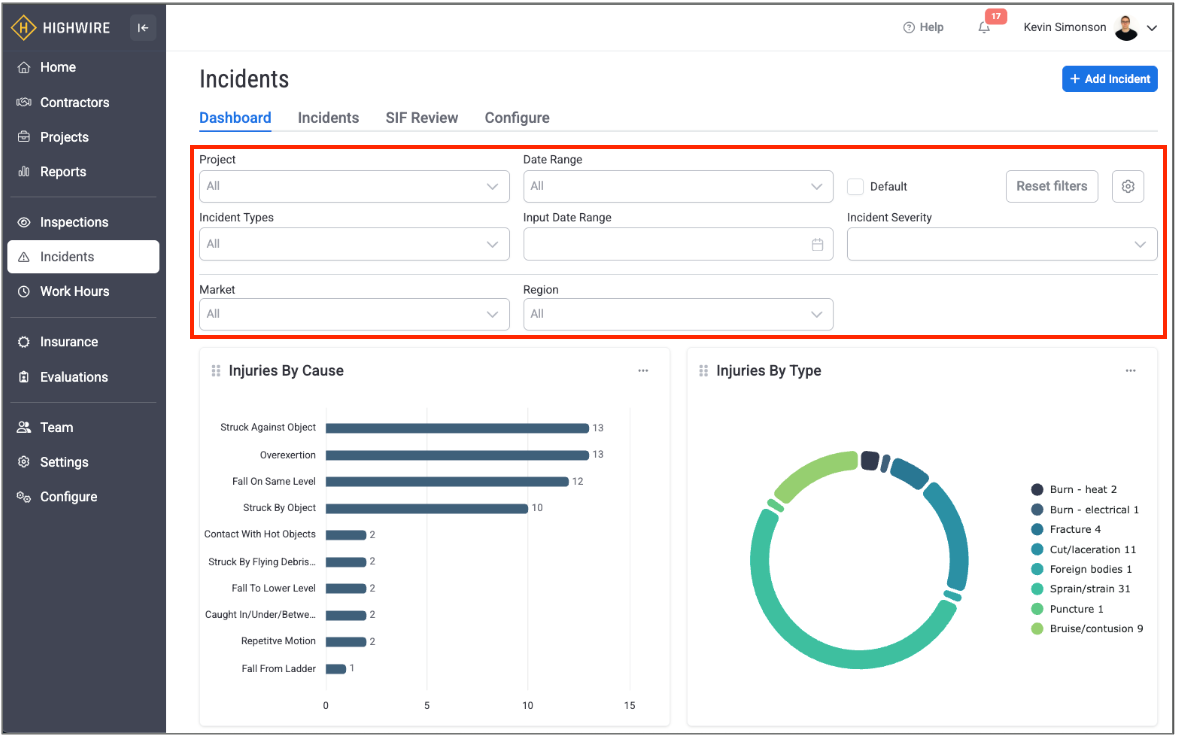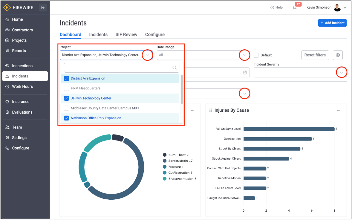 By clicking on a drop-down menu, you can select the specific criteria that you are looking for. In the example below, the incidents have been filtered to include three particular projects. You’ll notice that your charts automatically update to reflect the filters that you set: