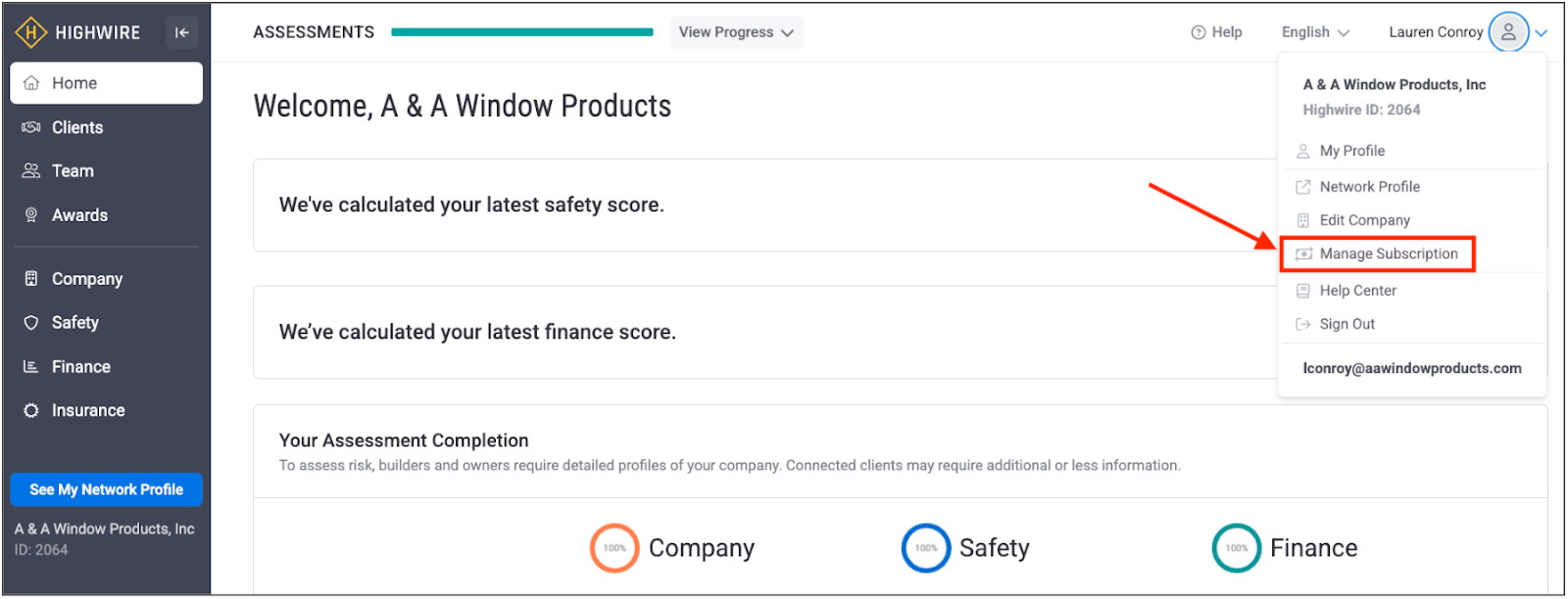 To view your current subscription plan, navigate to the top right corner of your profile and click your name. Then, select “Manage Subscription” from the drop-down menu.