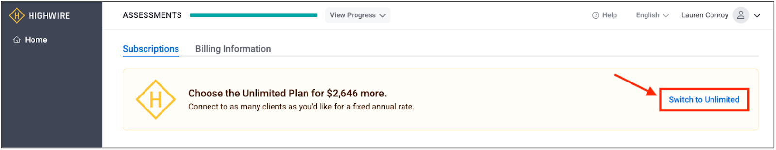At the top of your Subscriptions page, you will see a banner presenting the Unlimited Plan. Click “Switch to Unlimited” to proceed to the payment page.