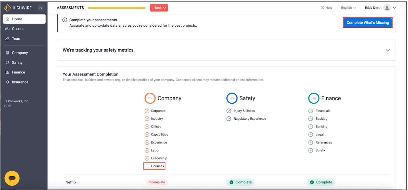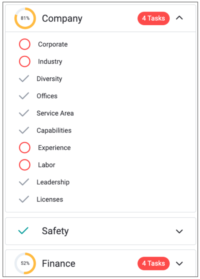 Click on the task with the red circle to be brought to that unfinished section. Identify any missing fields and fill in any details or select the appropriate answers. Once you complete the necessary Safety or Finance sections, a quality check will be conducted, and your score will be calculated. Once a score is calculated, your profile will be shared with the clients you’ve selected on the Partner's list. You can read more about your score here.