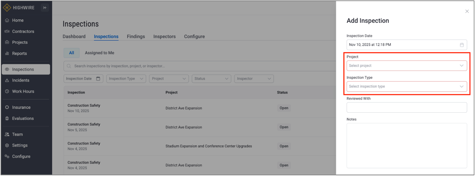 This will open up a slide-over panel where you will be prompted to select the Project from the first drop-down, followed by the Inspection Type from the second drop-down: