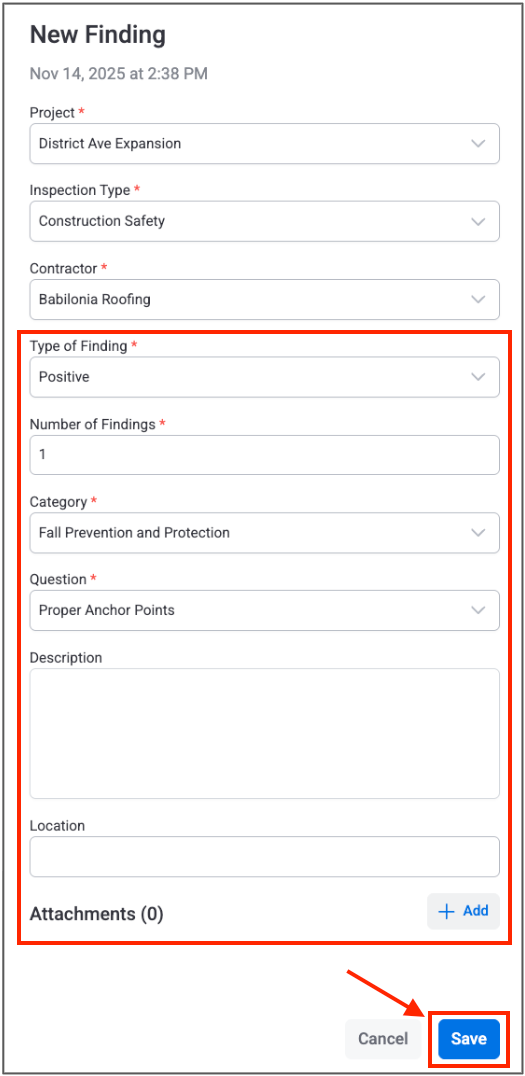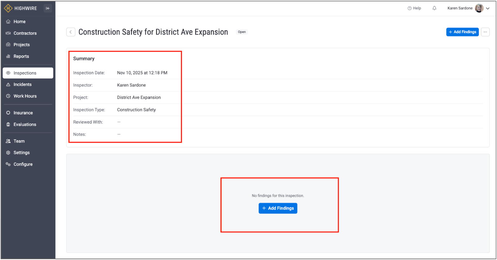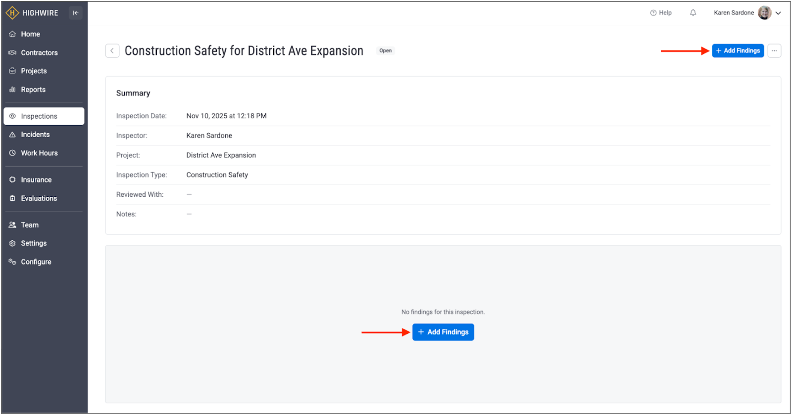 Once you click the “Create” button, you will be brought to a separate overview page for the new inspection. This overview page is broken down into two main parts: details of the inspection at the top (date, inspector, project, etc.), and a section to add new findings at the bottom: