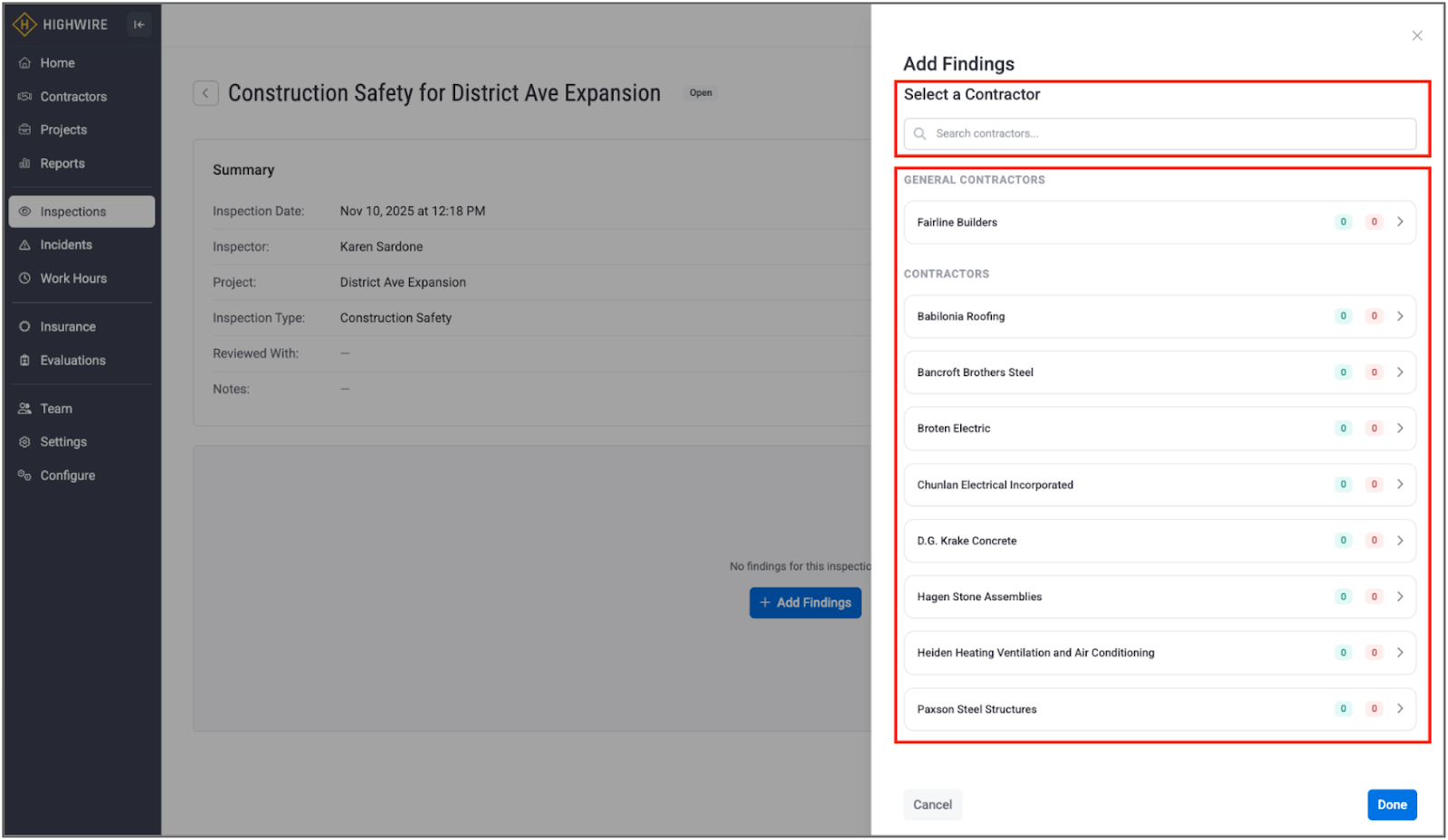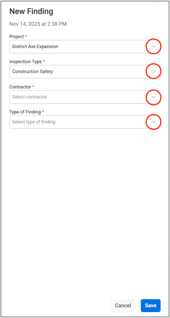 In the side panel, select the Project, Inspection Type, Contractor, and Type of Finding:
