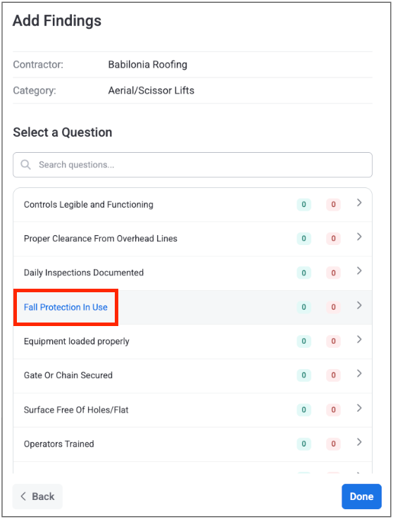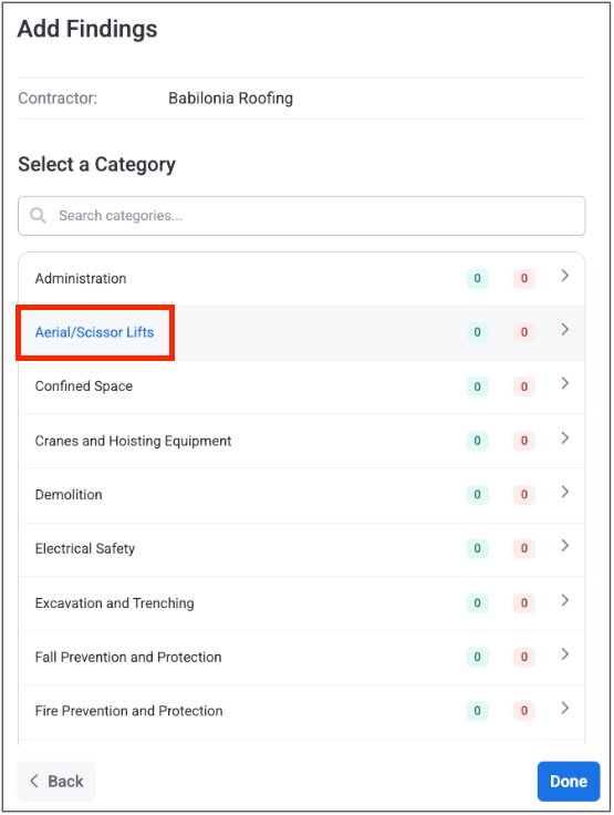 For reference, below are some example negative findings and their associated risk level for several different construction safety categories: