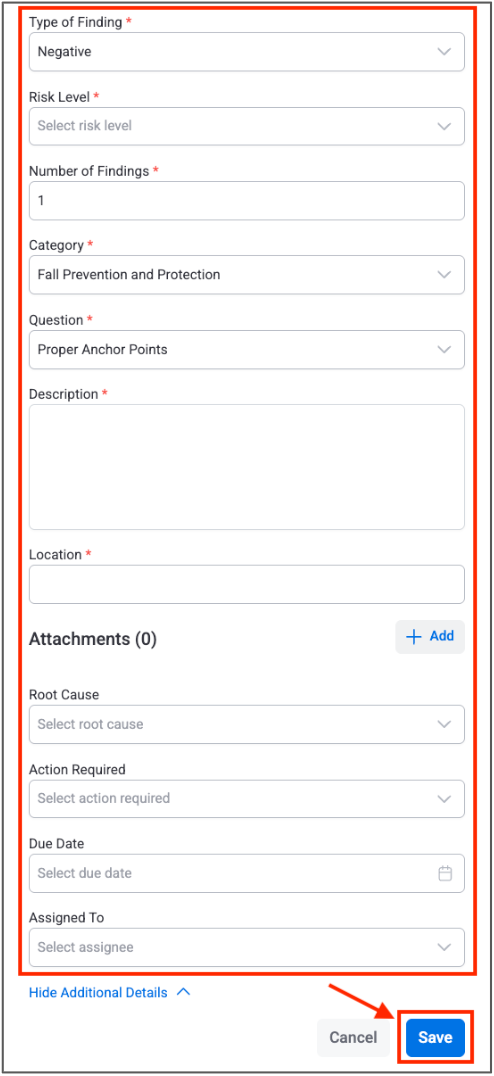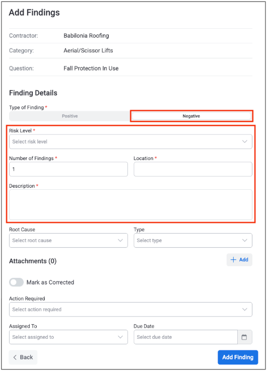 For negative findings, you are required to enter: Risk Level, Number of Findings, Location, and a Description. You can also choose to add a Root Cause and Type, and add an attachment by clicking the “Add” button.