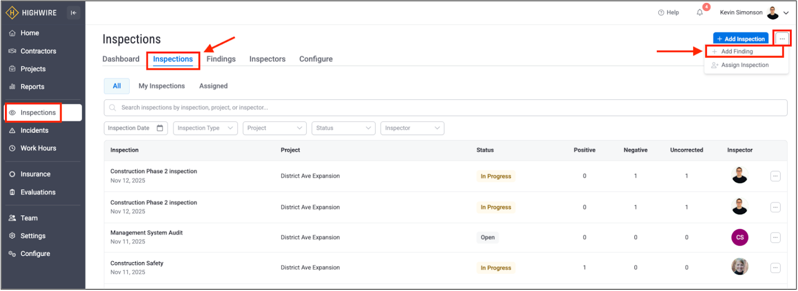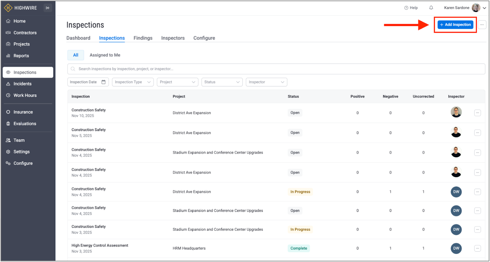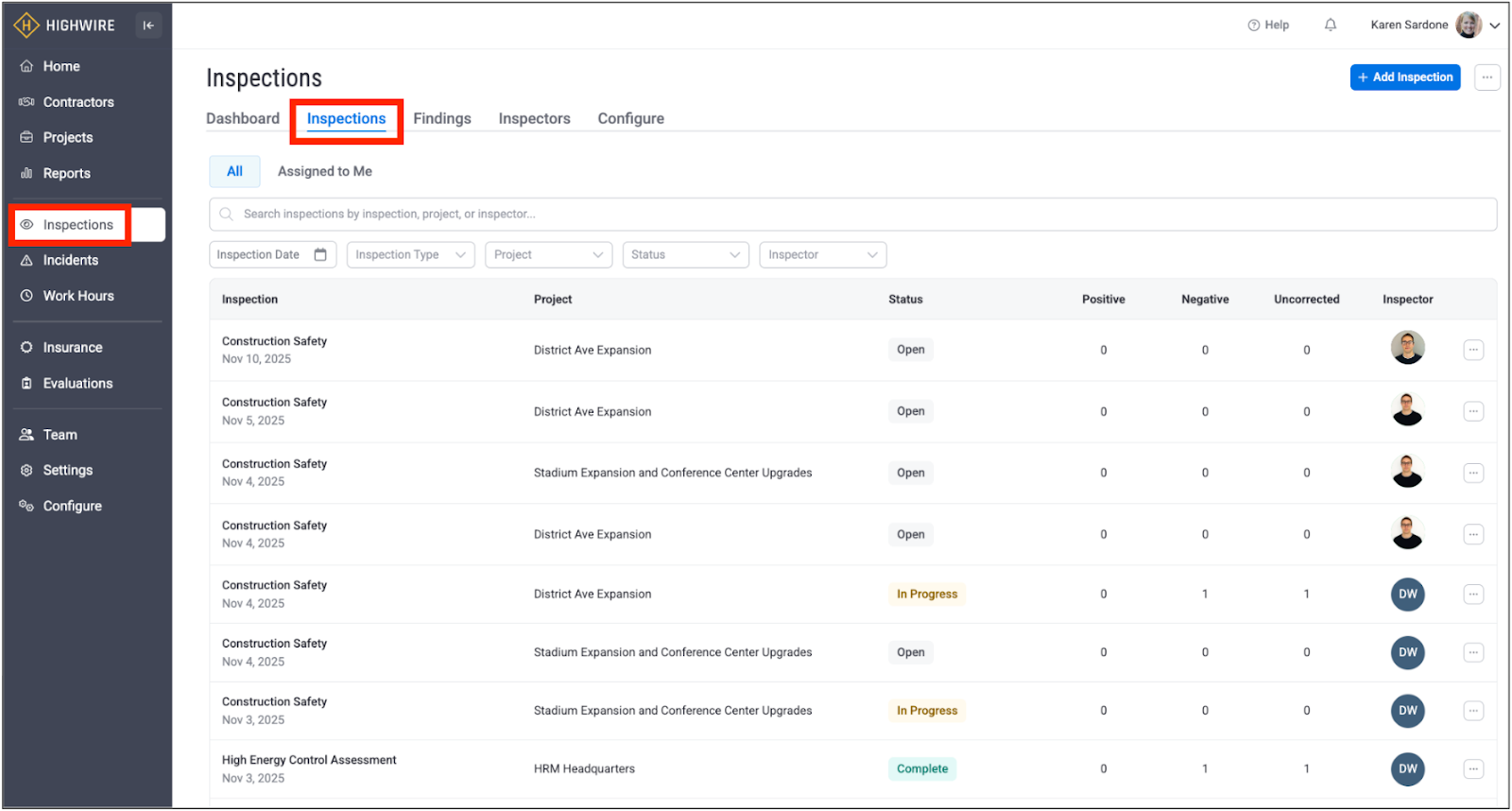 This high-level view lets you quickly see all inspections, including the type and date of the inspection, the associated project, the status, the number of findings broken down into positive, negative, and uncorrected, and the inspector: