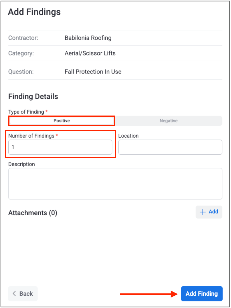 With positive findings, you are required to provide the Number of Findings. You also have the option to add a Description and Location for the finding and to upload any attachments by clicking “Add.” When you are complete, click the “Add Finding” button at the bottom of the slide-over: