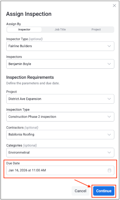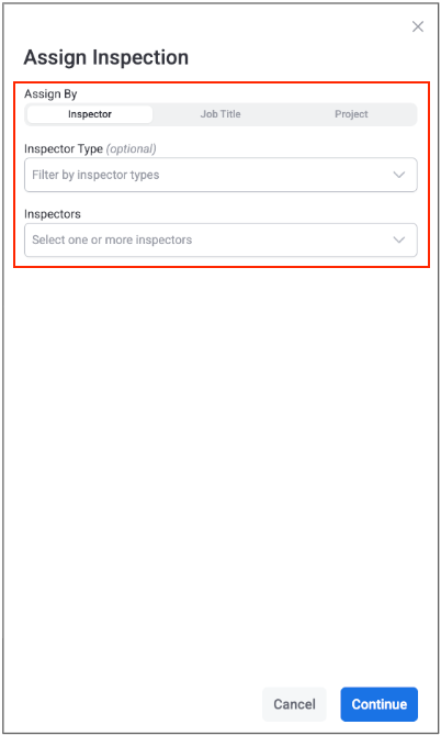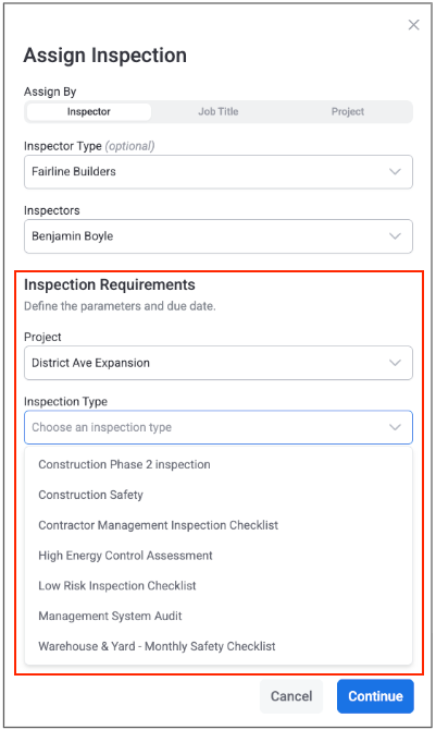 As you make selections, additional parameters will appear to further specify who you need to assign the inspection to: