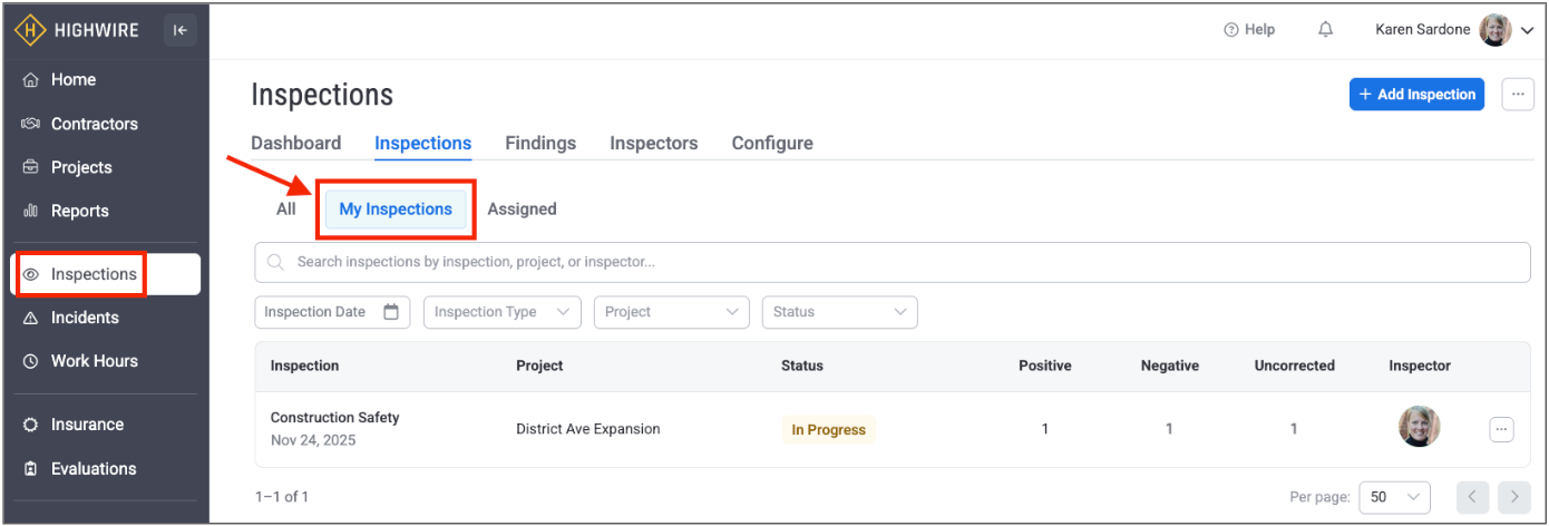 To view inspections assigned to yourself, click the “My Inspections” tab: