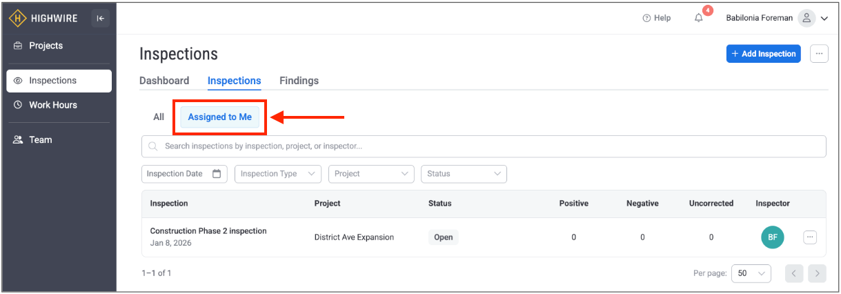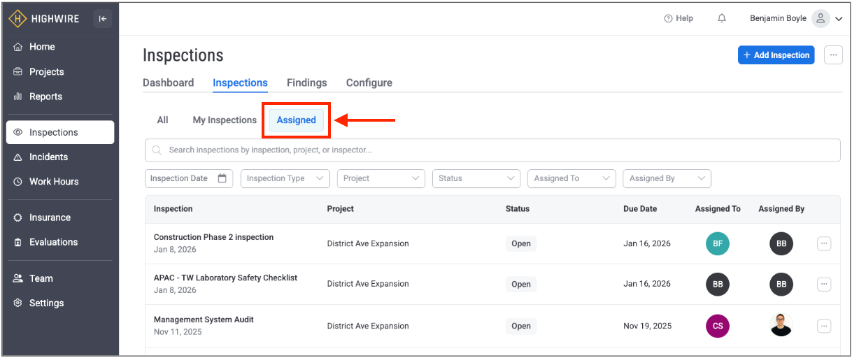 *Please note: If your user role does not have permission to assign inspections to other users, this tab will instead be named “Assigned to Me.”