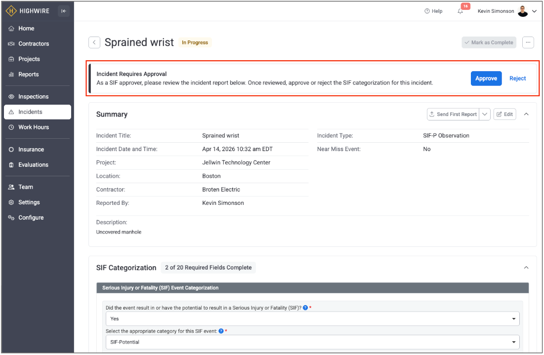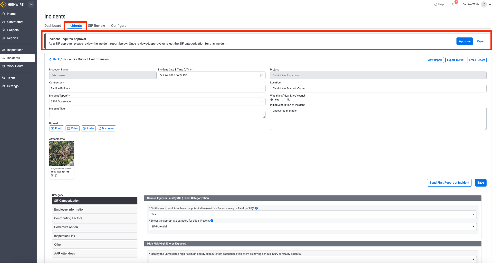 To review and approve an incident as a SIF, you can click on the specific incident to perform a detailed review and either approve or reject the SIF categorization: