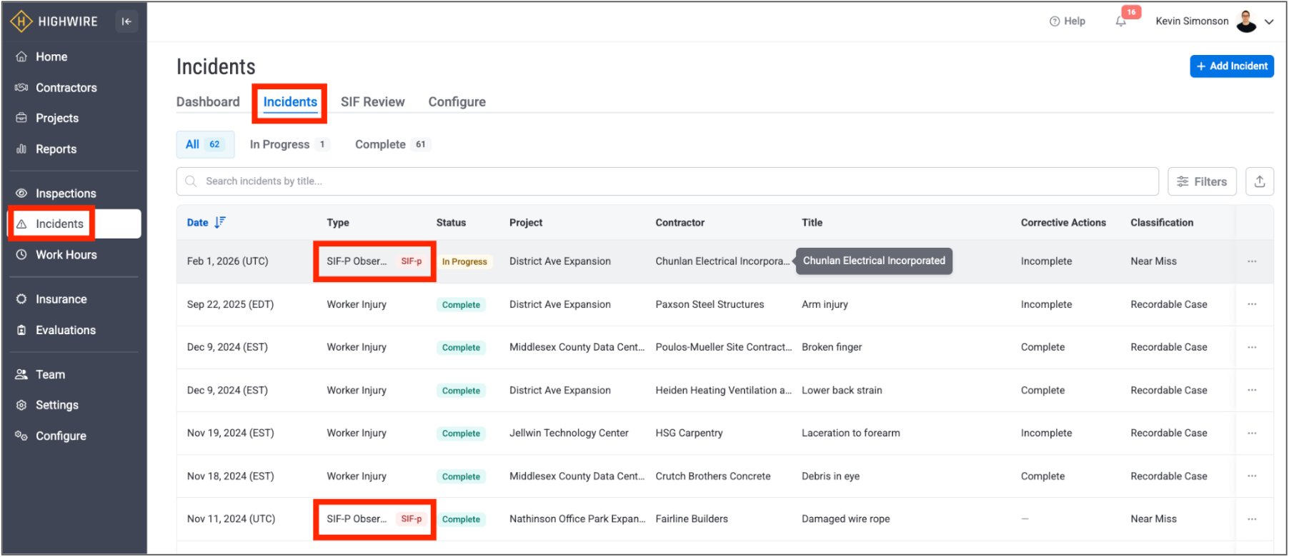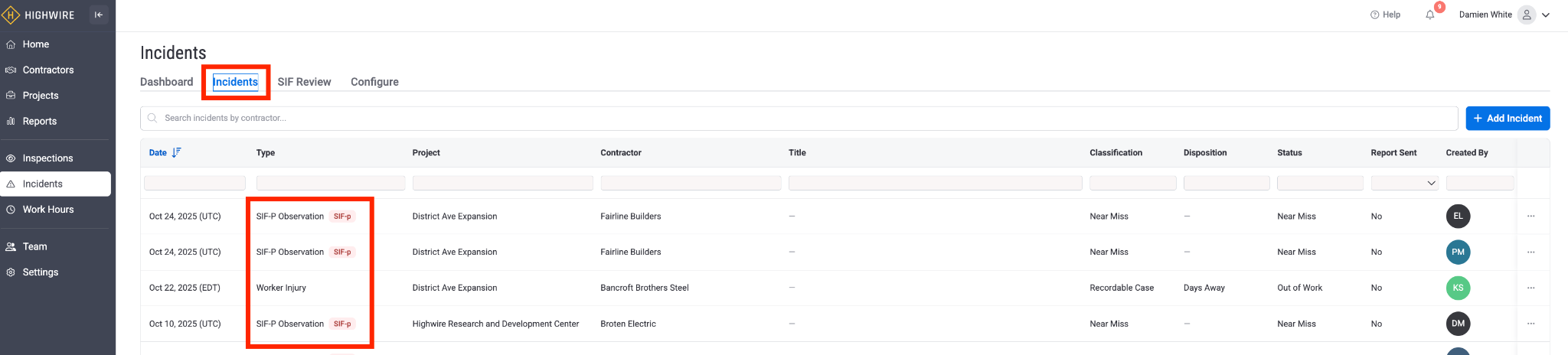 For Contactors that have been involved in one or more SIFs in the past 365 days, a SIF-p flag is triggered so that Clients can easily identify those Contractors in the Incidents tab: