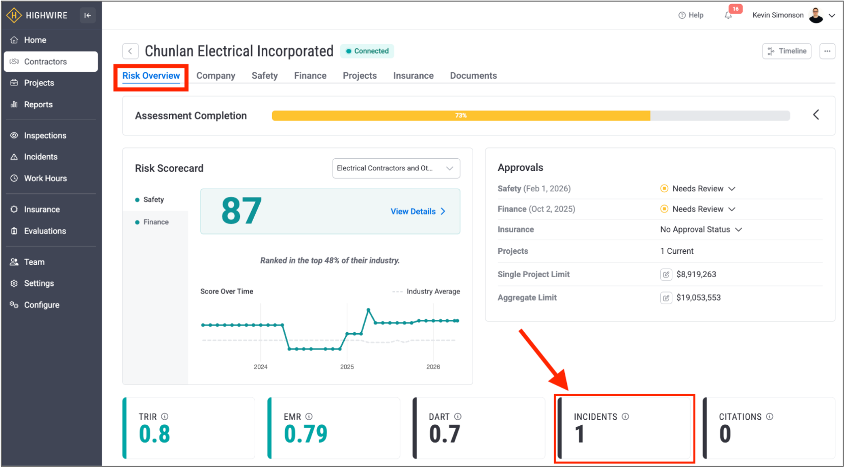 In addition, Clients can see the number of SIF potential incidents that a Contractor has been involved in on the Incidents card in that Contractor’s Safety Tab: