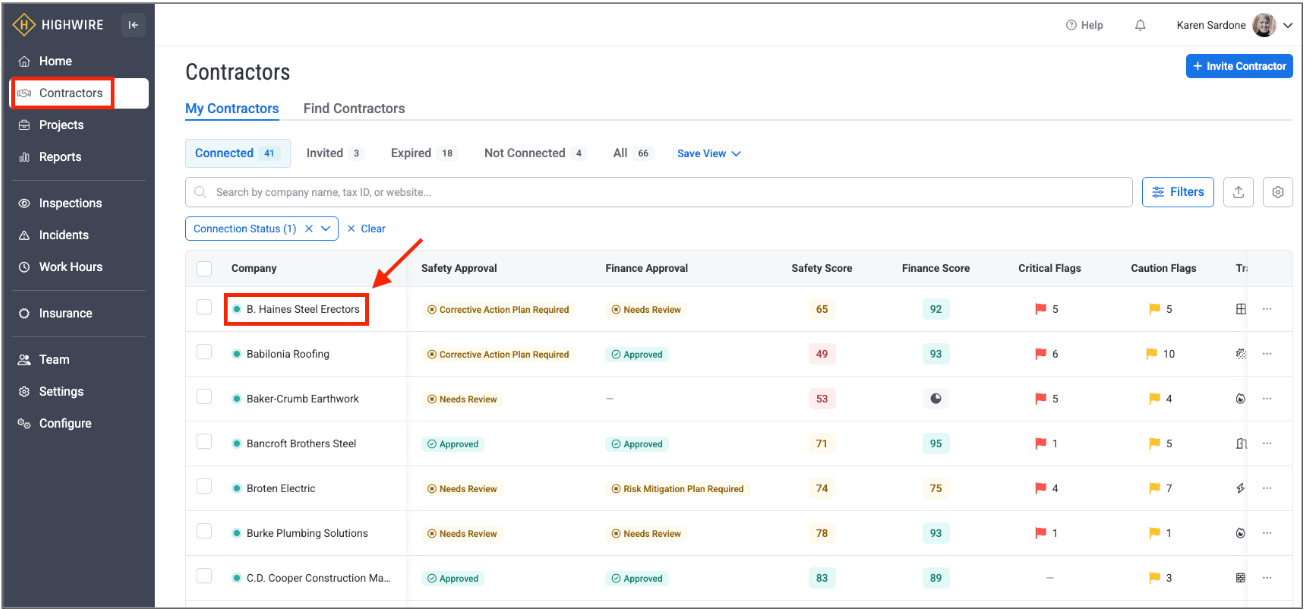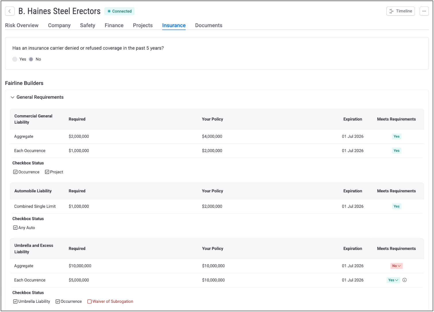1. On the Insurance page, you will find a detailed breakdown of the policies and limits listed on the contractor’s certificate of insurance (COI).