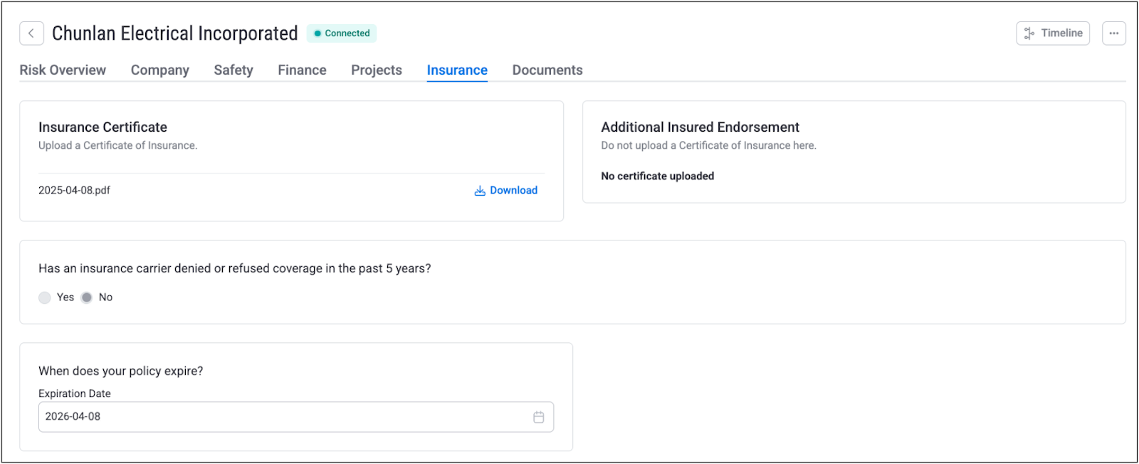 A contractor’s Insurance section offers a clear and detailed overview of their certificate of insurance, including policy information, coverage details, and expiration dates. You can easily access this section by entering a contractor’s “Insurance” section from their Risk Overview page. Depending on whether the contractor is located in the U.S. or operating internationally, you will see different information displayed.