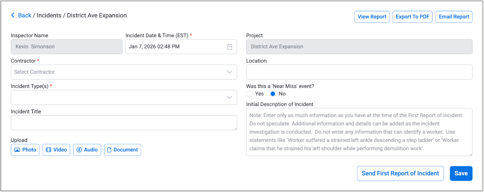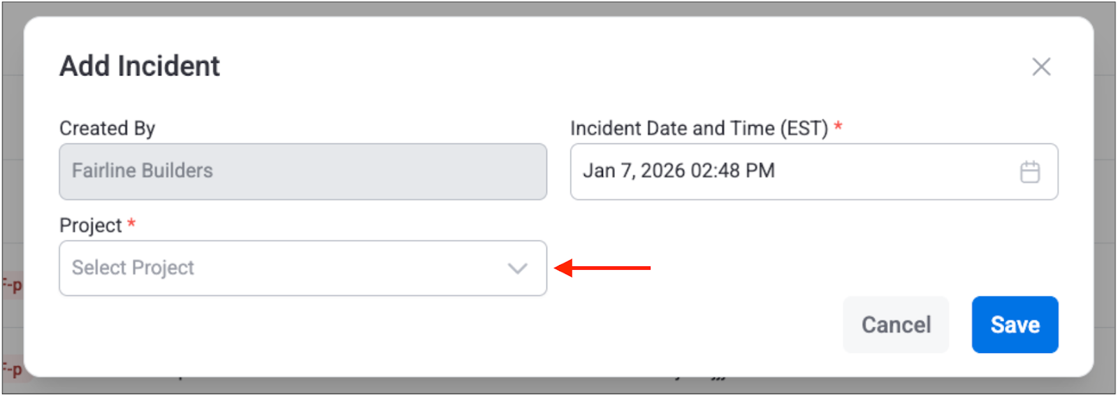 3. Select the project the incident applies to. The date will automatically populate with the date the inspection is created.