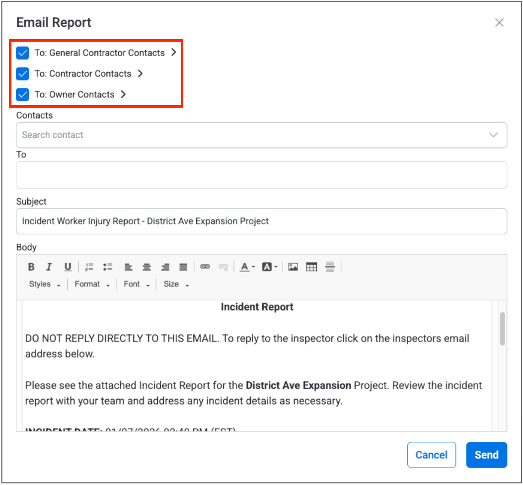 2. Select the appropriate contact(s) who should be notified of the incident. Modify each field as needed.