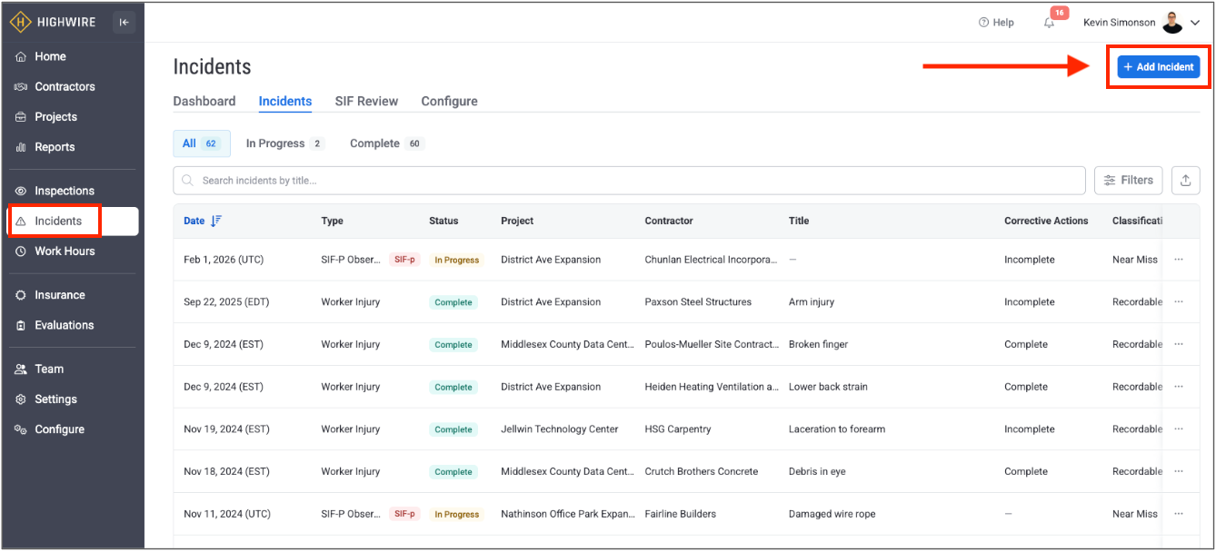 1. On the left-hand navigation, go to Incidents. Then, click the Add Incident button on the right side of the page.
