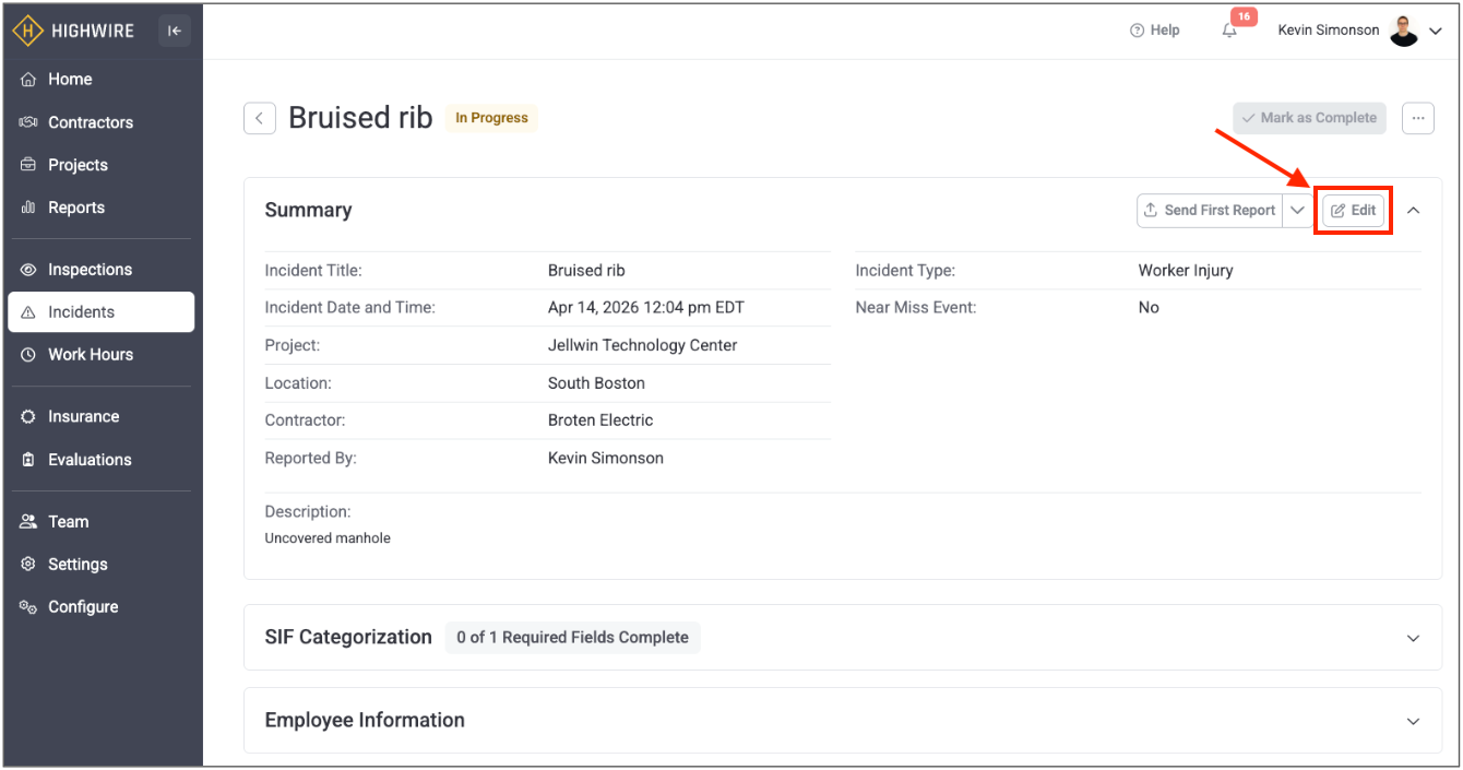 4. You will then be brought to the incident page, where additional information is required. If you need to make any changes to the primary details, click the Edit button to access the side panel again: