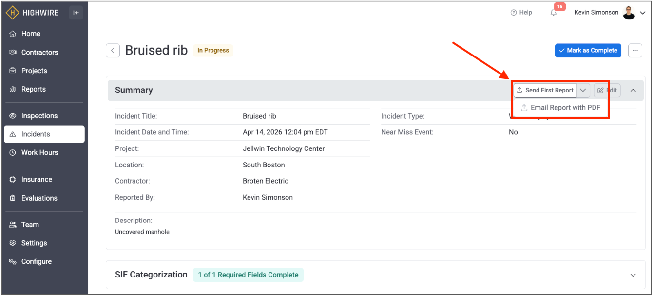 - Once you are ready to email the incident report, navigate to “Send First Report” near the top of the page. You can also include a PDF of the report by clicking the downward arrow and selecting “Email Report with PDF.”