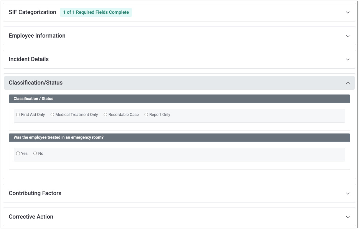 Further down the incident page, you will see additional sections for more specific information. The SIF Categorization must be answered before you can mark the incident as complete.