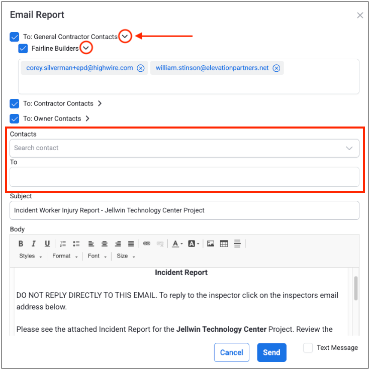 2. In the pop-up window, select which contacts you would like to send the incident to. You can also manually enter email recipients via the “Contacts” and “To” fields. Then, click Send.