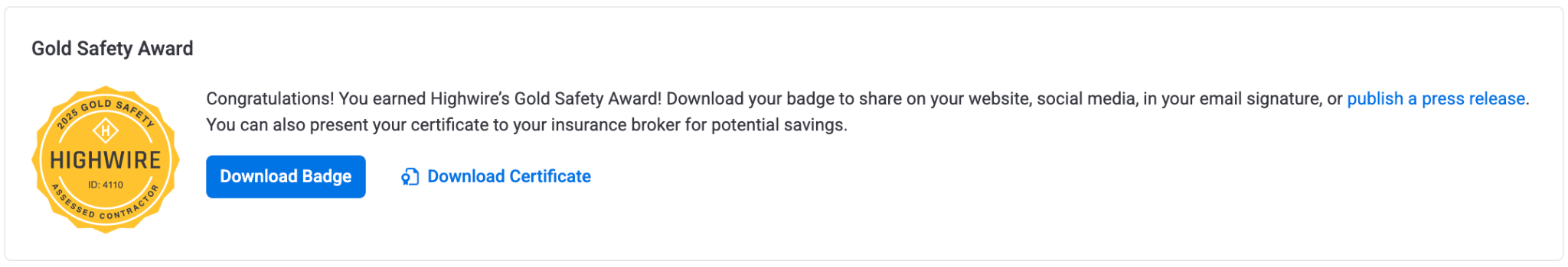 3. Your Safety score may be high enough to receive Highwire’s Gold or Platinum Safety Award. If so, your Certificate of Completion will include a display of the award on the second page of the certificate.