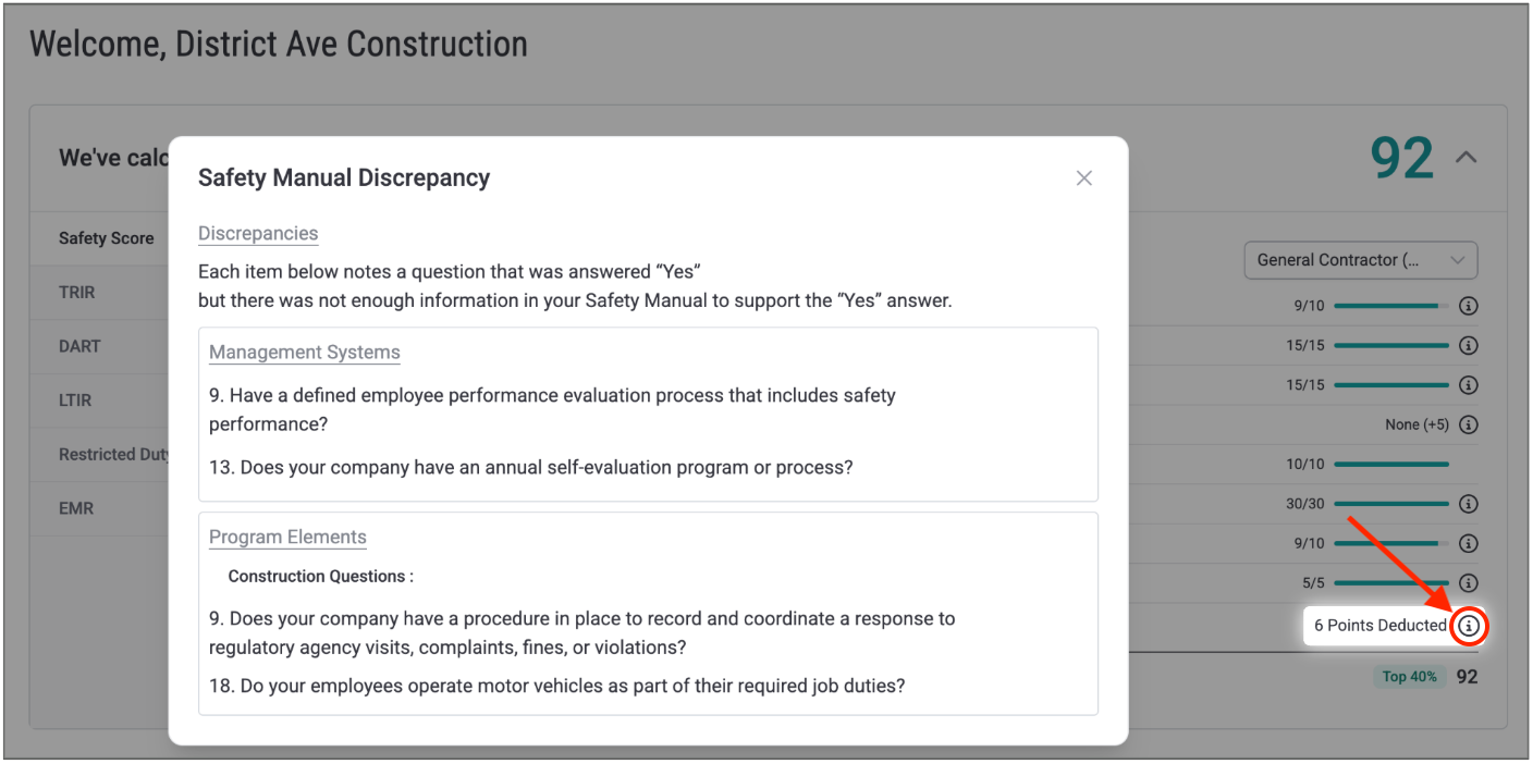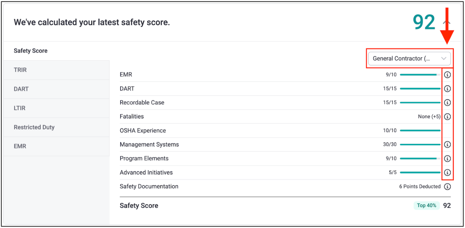 The safety score is calculated through a combined analysis of your lagging and leading indicators, as well as the safety programs you have uploaded. Click any of the info iconson the right side of the breakdown for more detailed information on each datapoint.