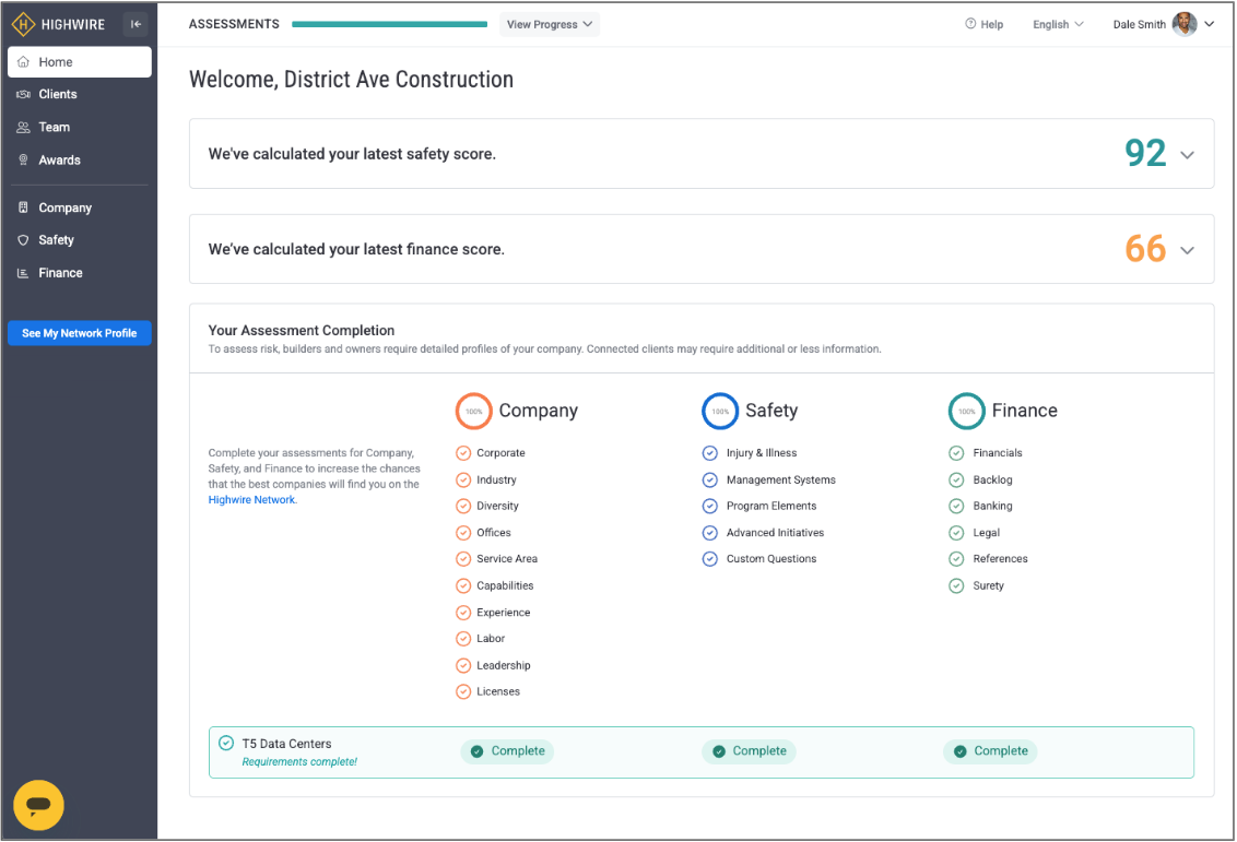This article provides an overview of the Home page of your profile. The Home page displays information on your Safety Score, Finance Score, and Assessment Completion status.