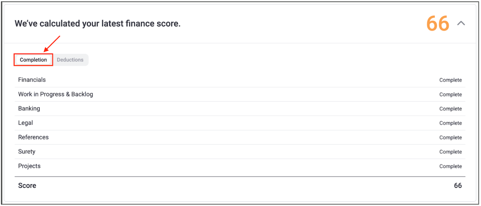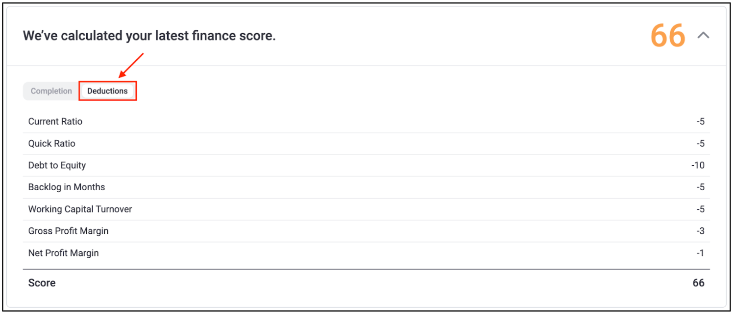 The Finance Score is based on the completion percentage of the Finance section and the quality of the uploaded financial documents. To view the status of each item that factors into the finance score, you can toggle between the “Completion” and “Deductions” tabs, shown in the screenshots below.