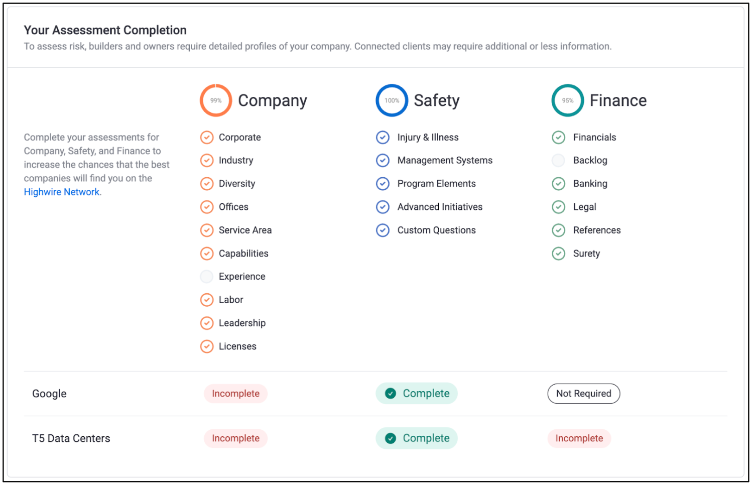 Each column displays a list of the different sections contained within the three assessment categories. Any section(s) with unfinished items will be affixed with an empty, gray circle. Completed sections will have a colored checkmark.