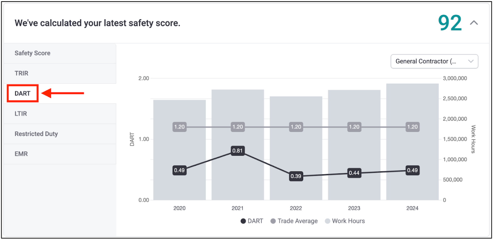 View your data trends across the past five years compared with your selected trades’ industry averages. Select a data point on left side of the table: